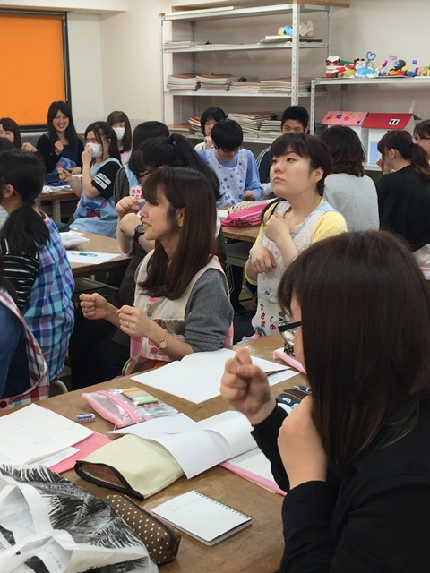 それぞれの仕事にはそのユニフォームがあるように、保育のユニフォーム・エプロンを初めて身に着けて受ける授業が保育士科で今日、行われていました。