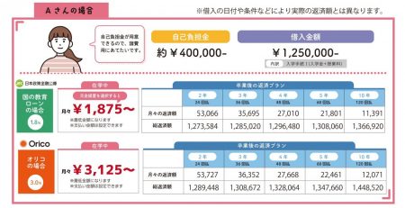 現在の自己資金の状況で進学を諦めないでください。こちらでは”国の教育ローン”や”オリコ”より借り入れをすることで在学中に返済の負担になる金額や卒業後の返済負担金額がどのくらいになるのか例をあげております。