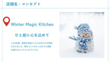 2組の店舗名は「Winter Magic Kitchen」、「ひと皿に心を込めて」という温かなコンセプトを掲げ、2回の販売実習で累計約33万円という売上を記録しました。1回目の実習で約12万円の売り上げがあったので、2回目に向けてさらに高いハードルを課しました。「1回で20万円を売り上げる」という野心的な目標を掲げ、クラス一丸となって戦略を練り直しました。