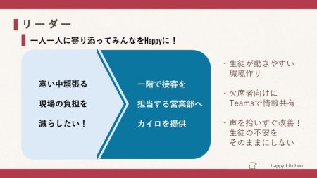 1組の店舗名は「Happy kitchen」、「HAPPY~心あたたまるもの~」をコンセプトに掲げ、お客様の心に寄り添う食の提供を目指しました。