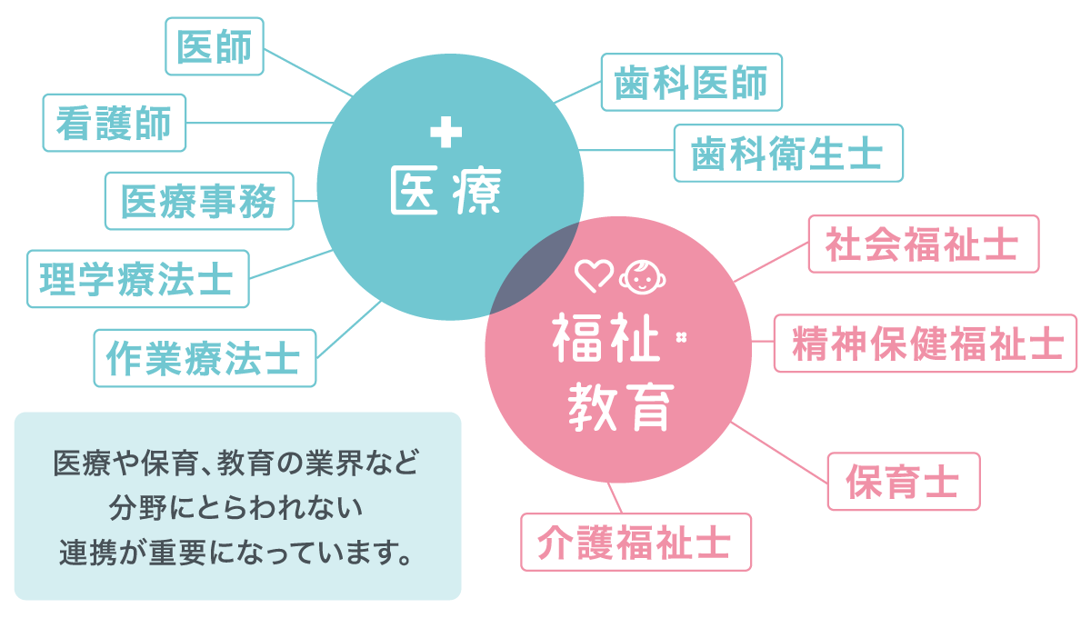 これからは、医療職である医師・歯科医師・看護師・理学療法士・作業療法士・栄養士などの連携はもちろんのこと、障害のある方が住み慣れた地域で生活を続けられるために医療と福祉の多職種連携が必須になります。例えば、高齢者施設や在宅では、介護福祉士や介護支援専門員や地域包括支援センターなどの職員、小児の分野では、保育士や相談支援専門員などとの連携です。